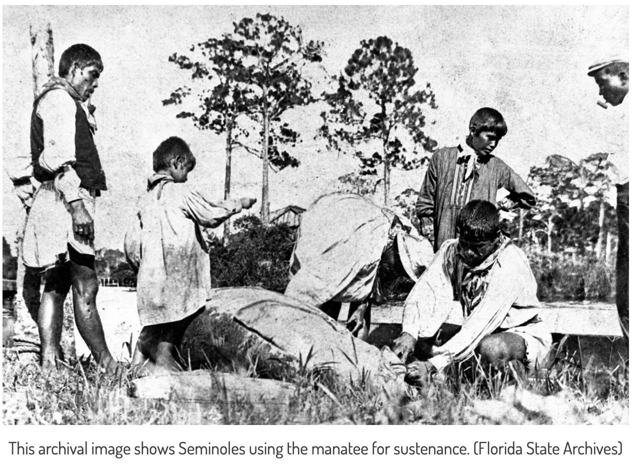 In the past, sea cows weren’t sacred mascots, but a source of sustenance. Manatees once fed Indigenous peoples and settlers across the Americas. Globally, their cousin the dugong, still ends up in cooking pots across the Pacific.